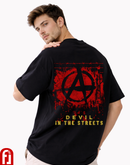 The back reveals a bold grunge-style anarchy symbol layered with distressed textures and the text “DEVIL IN THE STREETS”. High-contrast red and gold tones create a powerful visual impact, making the tee a true streetwear statement from behind.